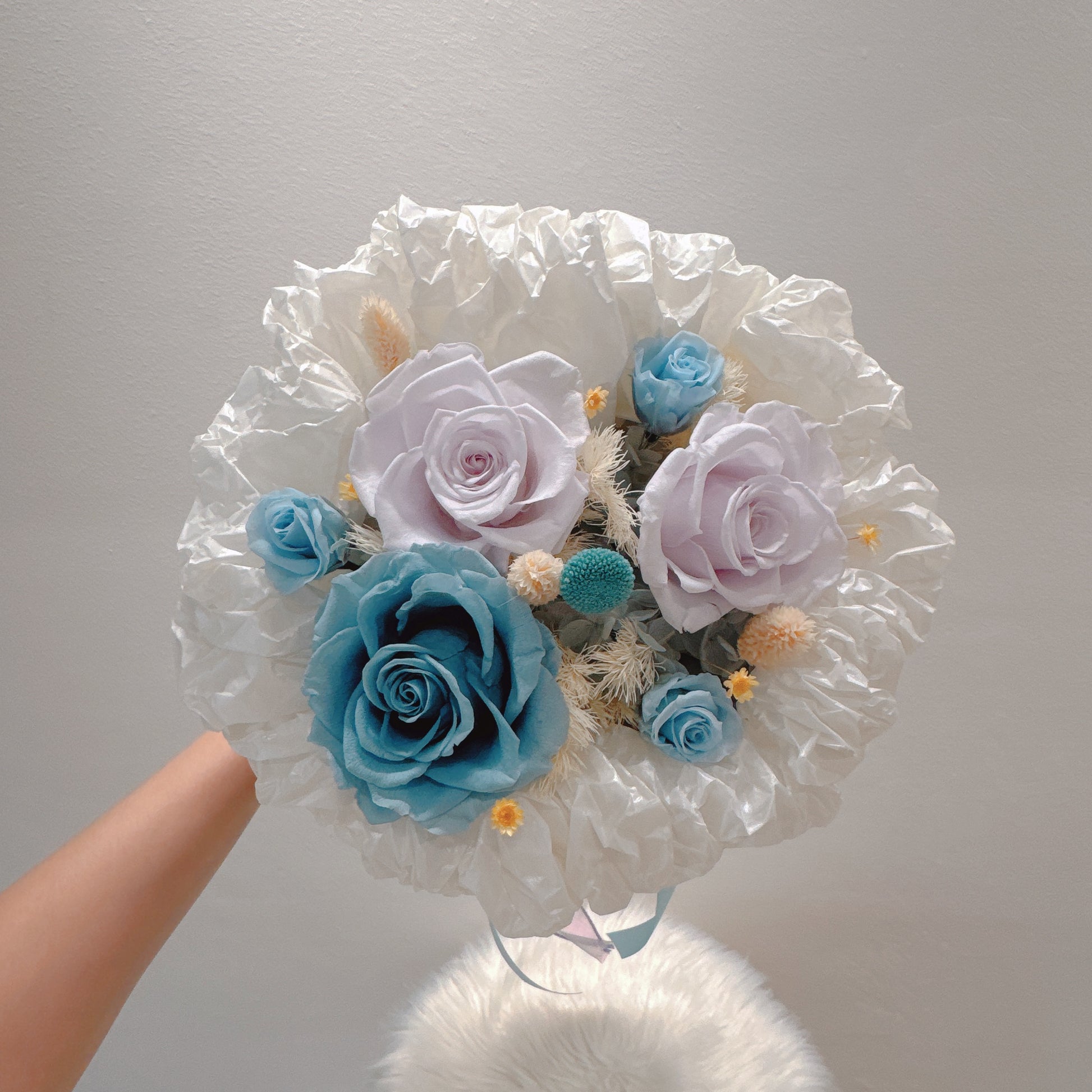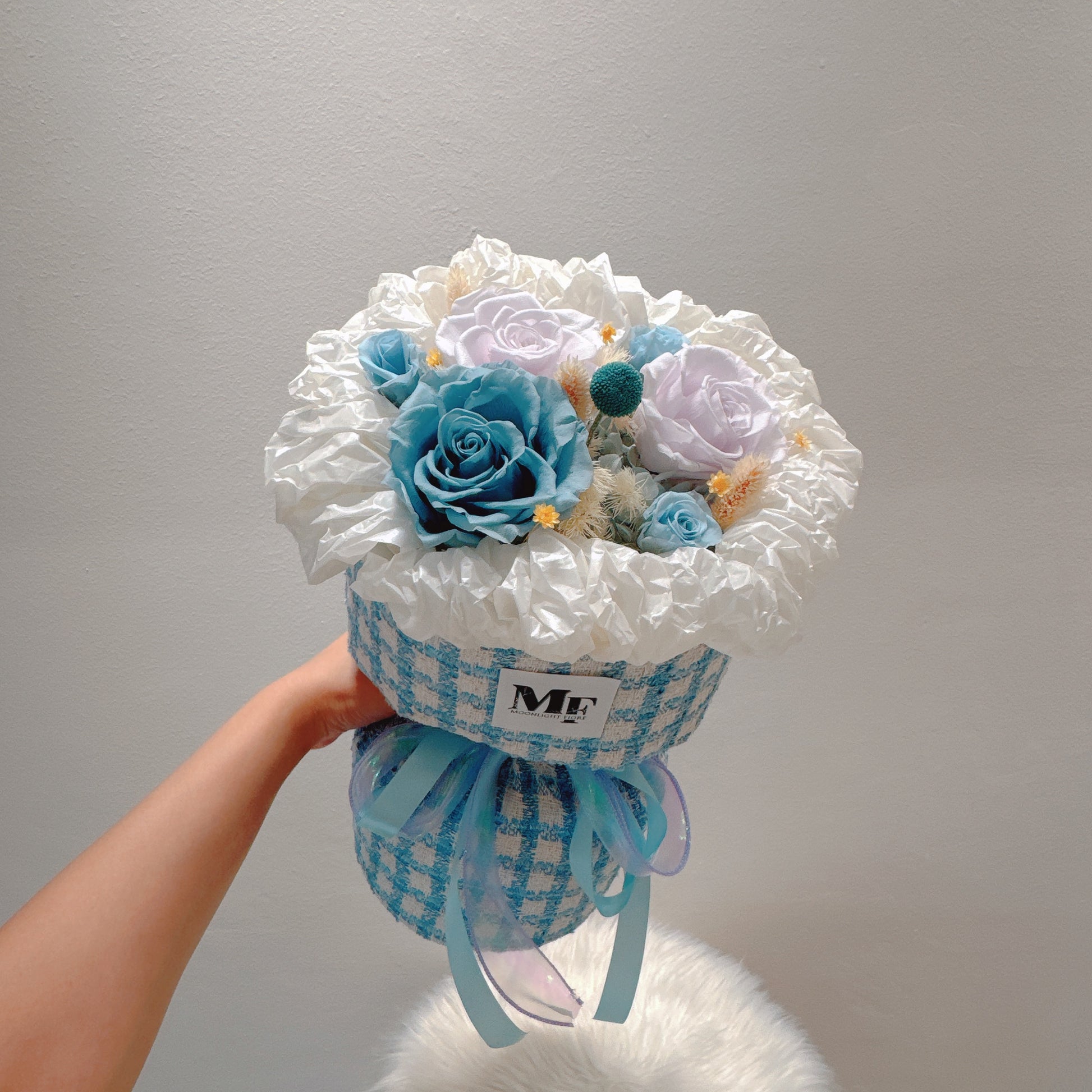 Handcrafted preserved floral arrangement showcasing mixtures of big and small roses, presented in an elegant round tweed design. This timeless composition celebrates Valentine's Day with botanicals selected for their enduring beauty and sophisticated aesthetic appeal.